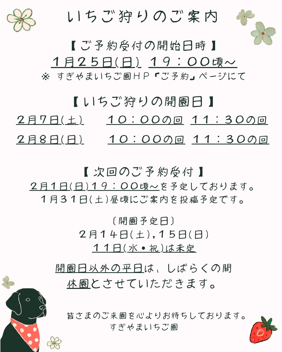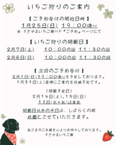 2月7日(土)、2月8日(日)分のご予約は、1月25日(日) 19:00頃~当園ホームページ内のご予約ページにて承ります。