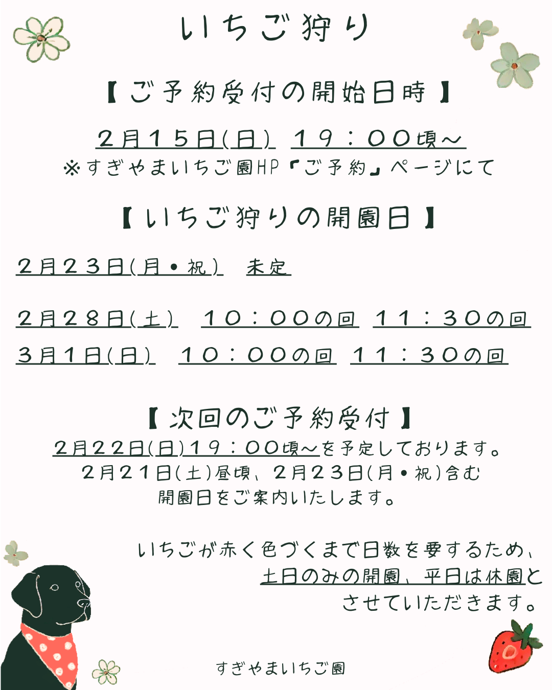 2月28日(土)、3月1日(日)分のご予約は、2月15日(日) 19:00頃~当園ホームページ内のご予約ページにて承ります。