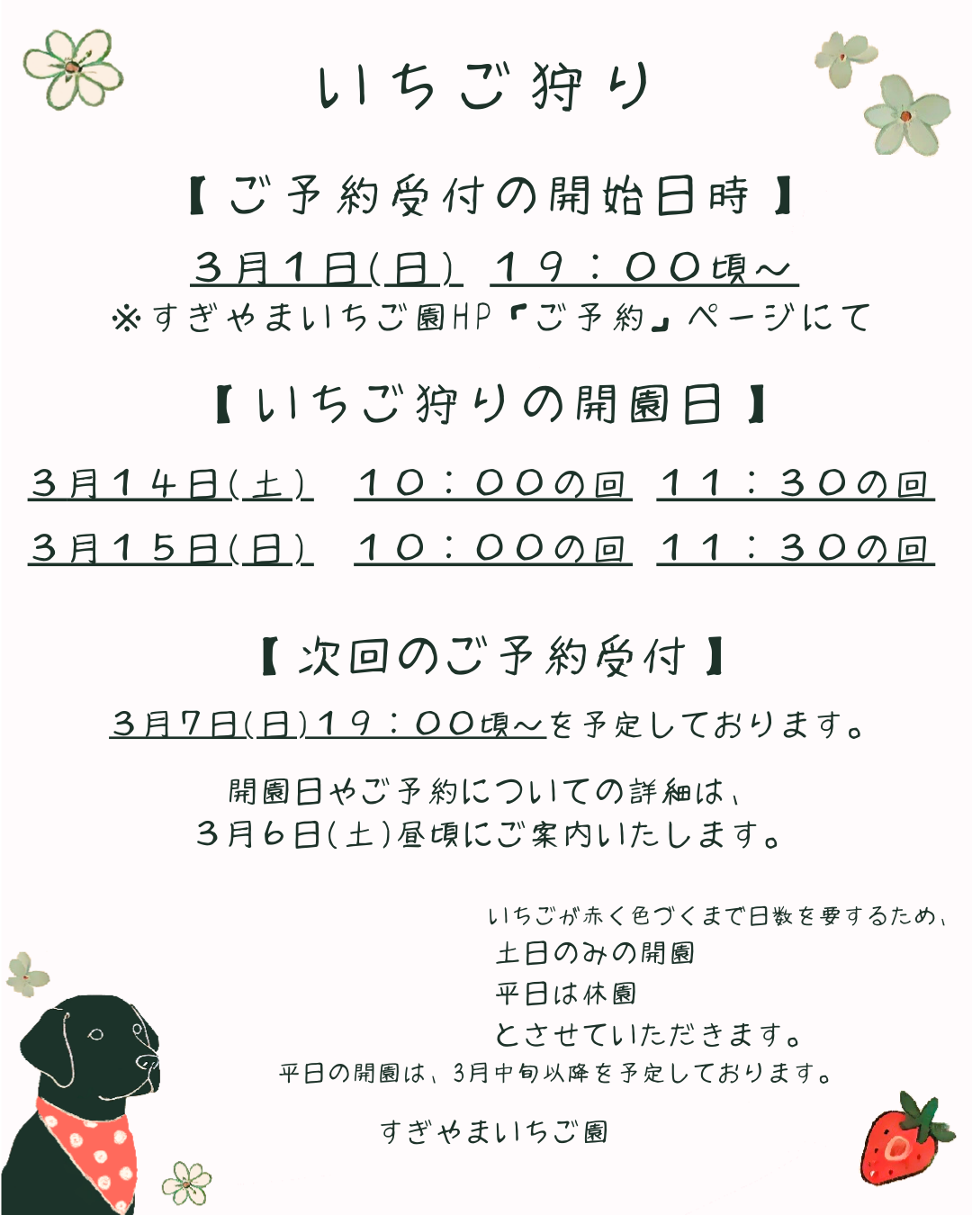 3月14日(土)、3月15日(日)分のご予約は、3月1日(日) 19:00頃~当園ホームページ内のご予約ページにて承ります。