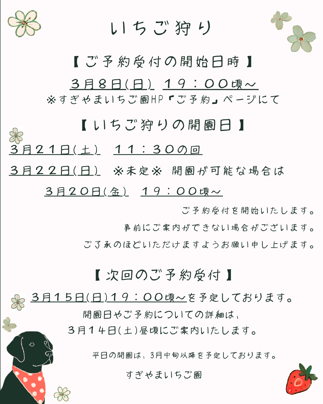 3月21日(土)分のご予約は、3月8日(日) 19:00頃~当園ホームページ内のご予約ページにて承ります。